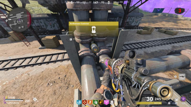 You can find the Aetherium Canister on top of the pipes located at the Train Loading area in the far western section of the Golova region.