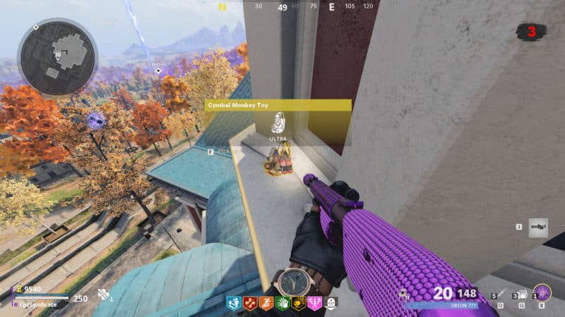 Keep moving forward and jump across to the pillar structure. Keep hugging the structure, and you will eventually reach the side facing the town. The cymbal monkey toy will be sitting at the ledge.