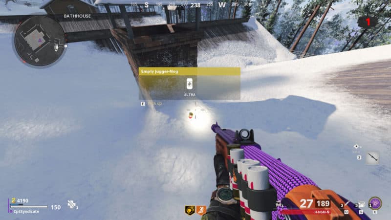 The artifact is found on the roof of the bathhouse located at the southern end of the Alpine region.You can use the cliff by the bathhouse to parachute onto the roof. The Empty Jugger-Nog is by the Chimney head.