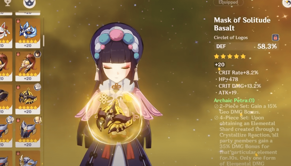 If you want to focus on increasing the damage of Yun Jin, you can equip 2 pieces of Archaic Petra and 2 pieces of Noblesse Oblige. 2 pieces of Archaic Petra will increase your Geo damage bonus by 15%. Equipping 2 pieces of Noblesse Oblige will increase your Elemental Burst damage by 20%. You can get the Archaic Petra in the Domain of Guyun and you can get the Noblesse Oblige in the Clear Pool and Mountain Cavern domain.