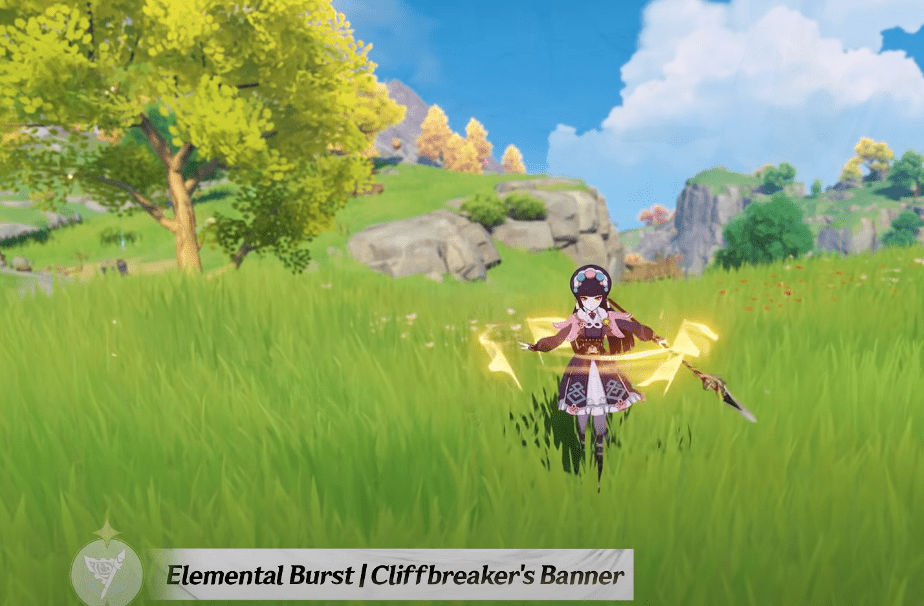 Cliffbreaker’s Banner is the elemental burst of Yun Jin. Activating this will allow Yun Jin to deal AoE Geo damage on her enemies. She will also give the Flying Cloud Flag Formation to all her nearby allies. If you have the Flying Cloud Flag Formation, you will get bonus damage depending on Yun Jin’s DEF if your normal attack hit enemies. You can trigger the effect multiple times if the character’s normal attack hit multiple enemies.