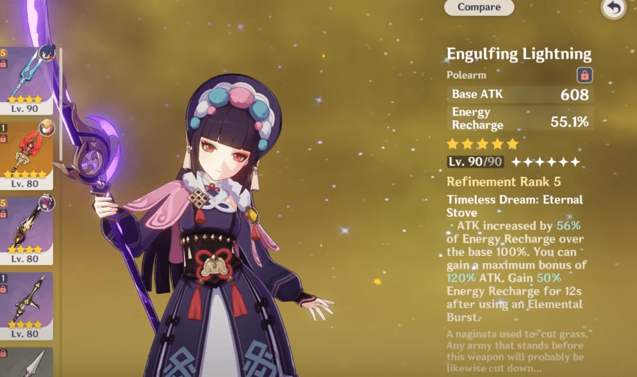 Engulfing Lightning is a 5-star Polearm that has the Energy Recharge substat. This polearm also gives you the Timeless Dream: Eternal Stove effect. Your attack damage will increase depending on the amount of Energy Recharge you have over 100%. This effect has a maximum bonus attack of 80%. You will also get a 30% Energy Recharge when you use an Elemental Burst.