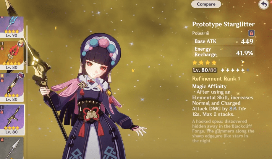 If you are looking for a craftable polearm for Yun Jin, you can use the Prototype Starglitter. This 4-star polearm has an Energy Recharge substat and gives you the Magic Affinity buff. Whenever you use an Elemental Skill, your normal and charged attack damage will increase by 8%. This effect has a duration of 12 seconds and you can stack it twice.