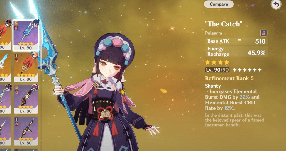 The Catch is a great, free-to-play 4-star Polearm option for Yun Jin. This Polearm also has the Energy Recharge Substat and it increases your elemental burst damage by 16%. It will also increase the Crit Rate of your Elemental Burst by 6%. You can get this weapon from the Inazuma Fishing Association.