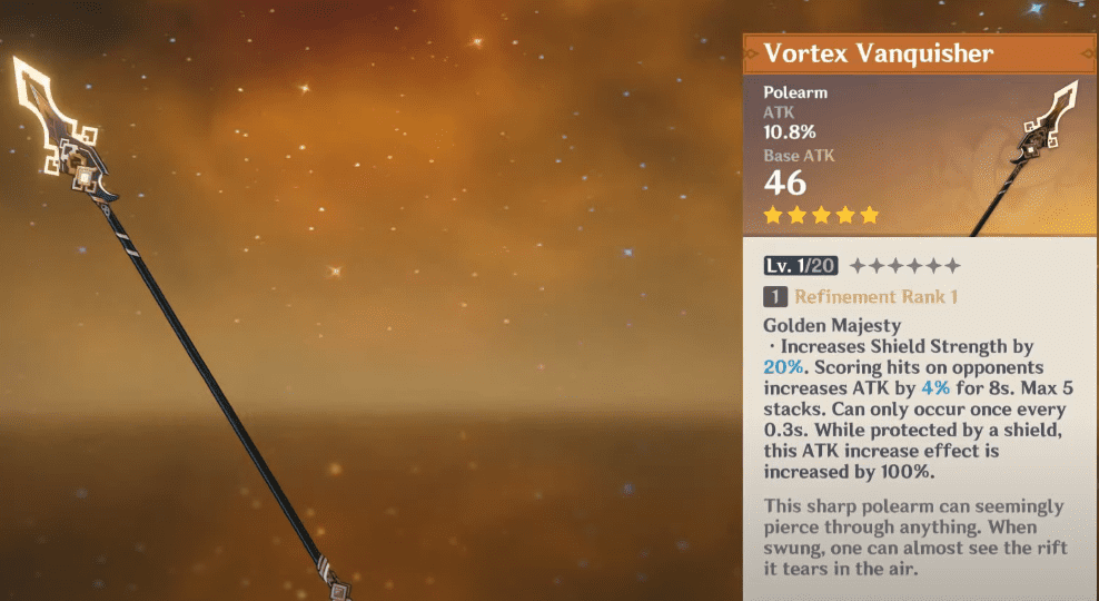 The Vortex Vanquisher is a 5-star polearm weapon that has an ATK substat. Equipping this polearm will increase the strength of your shield by 20%. If you successfully hit an enemy, your attack will increase by 4%. This effect has a duration of 8 seconds. If you are already protected by a shield and you proc this buff, the effect will increase by 100%.