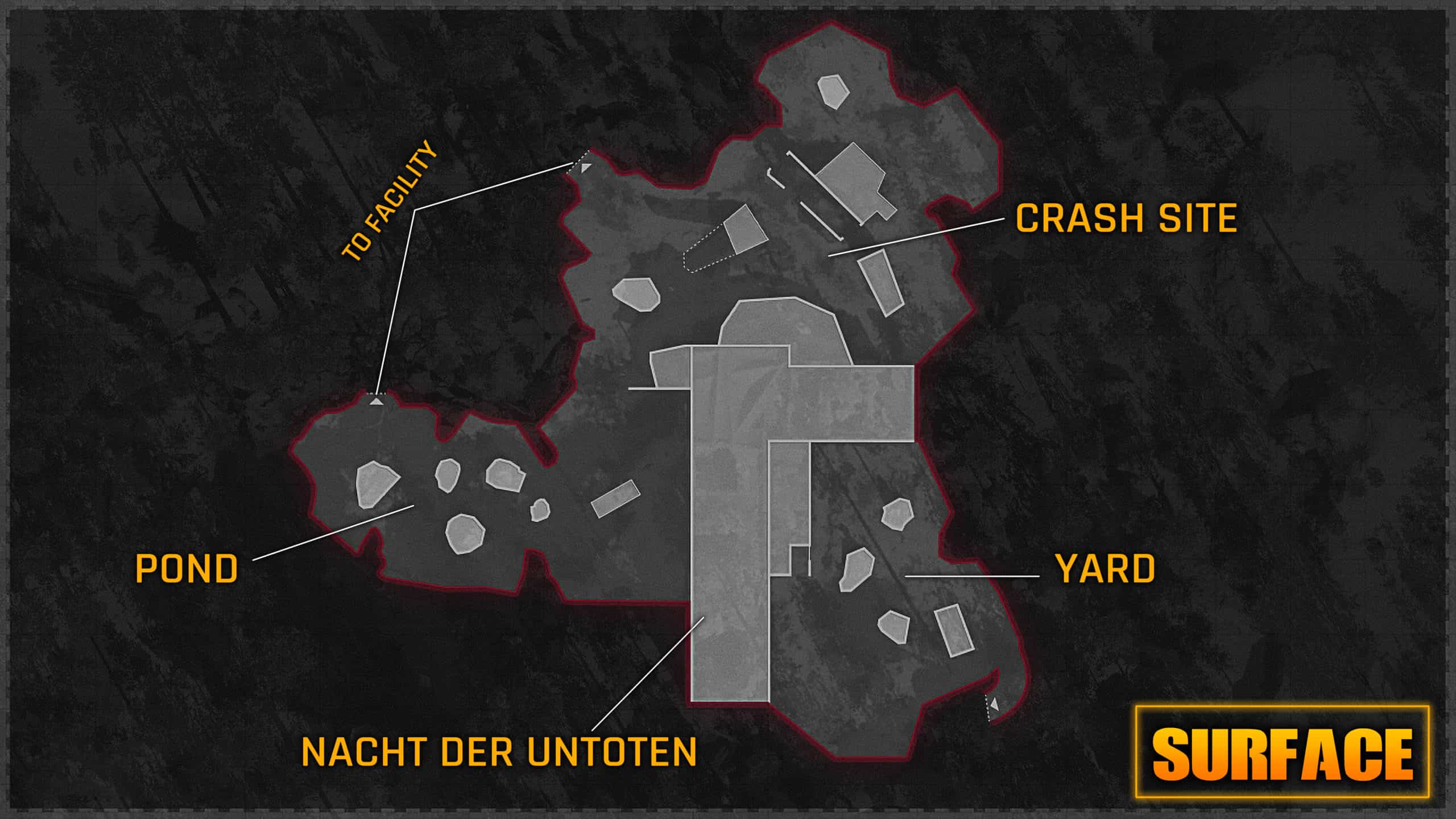 On the surface, you have Nacht Der Untoten in the center of the map surrounded by a yard (spawn), a crash site, and a huge pond area.