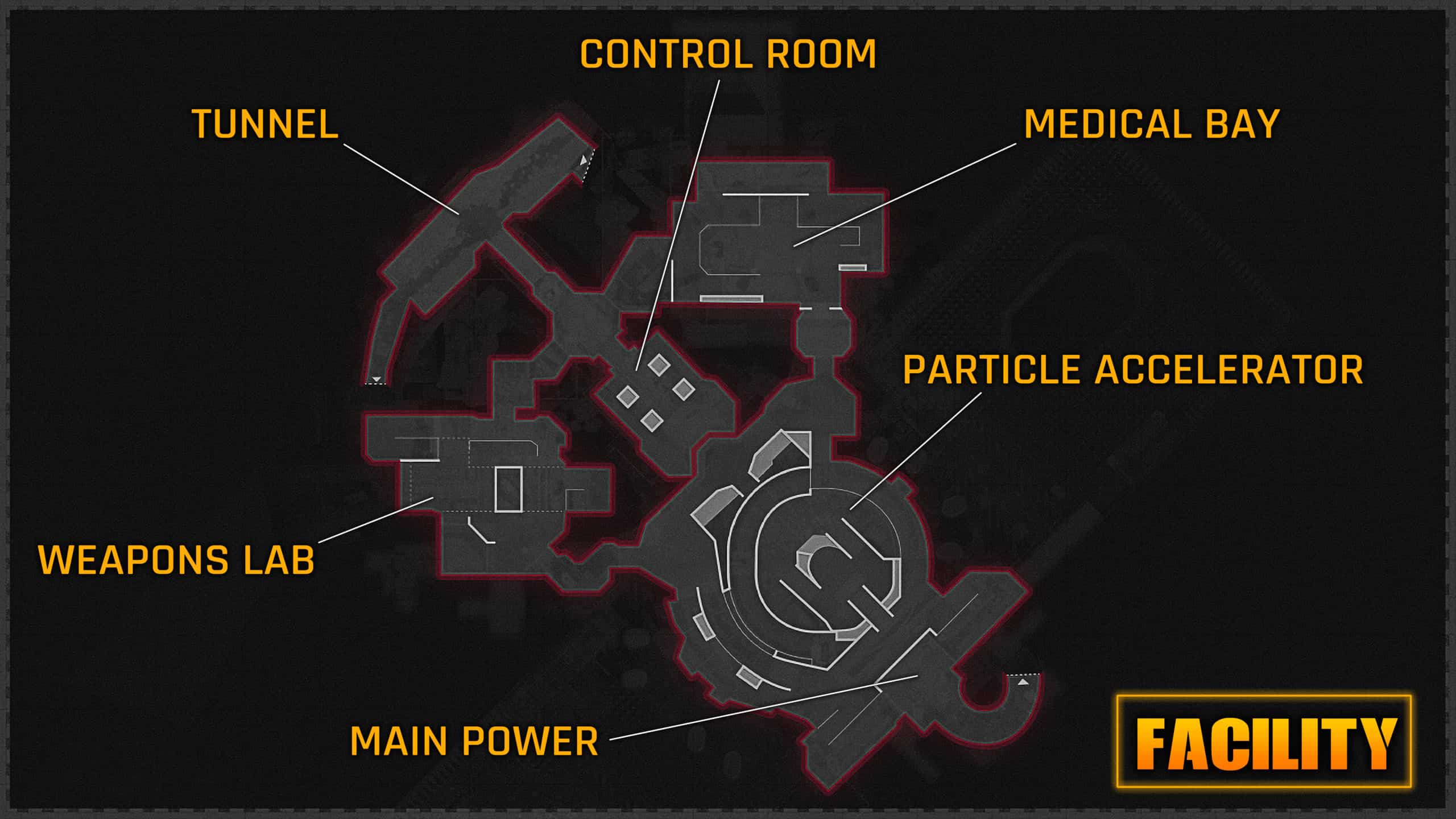 There are two tunnel entrances. One from the pond and the other from the crash site. Each takes you to the facility entrance. The facility consists of an enormous central particle accelerator, medical bay, weapons lab, control room, and main power room.