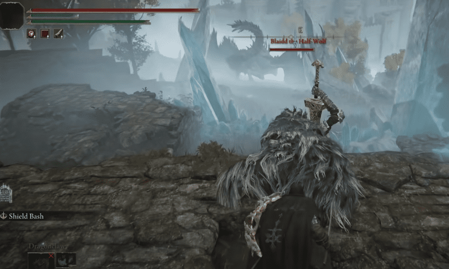When you exit Ranni’s Tower, you will see Blaidd, the Half-wolf sitting with his back facing you. He is immediately hostile to you when you approach him. If you approach him quickly, you can stab him in the back for extra damage. Blaidd will perform huge, swinging attacks with his sword. He will perform up to three to four attacks with his sword. Dodge to the back and you can deal damage during the attack delay.
