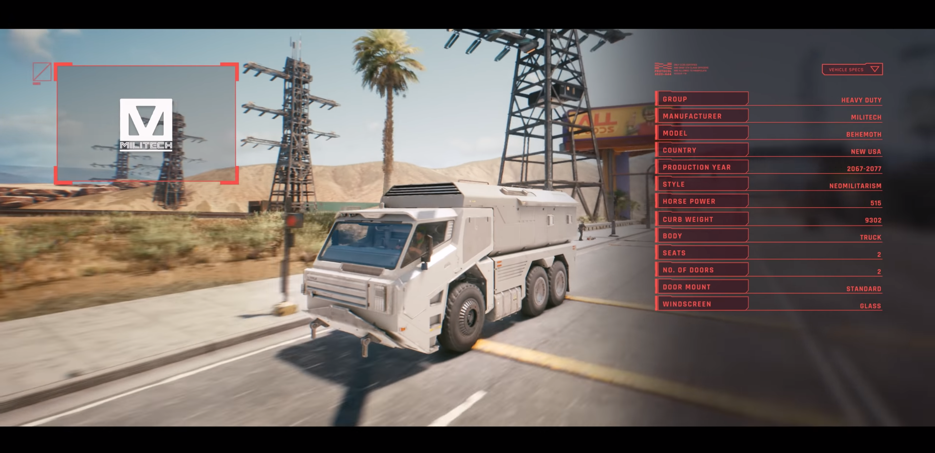 Heavy-Duty vehicles include trucks and vans manufactured by Kaukaz and Militech, for when power and brute force are needed for the most demanding tasks that cannot be carried out using your regular vehicles.