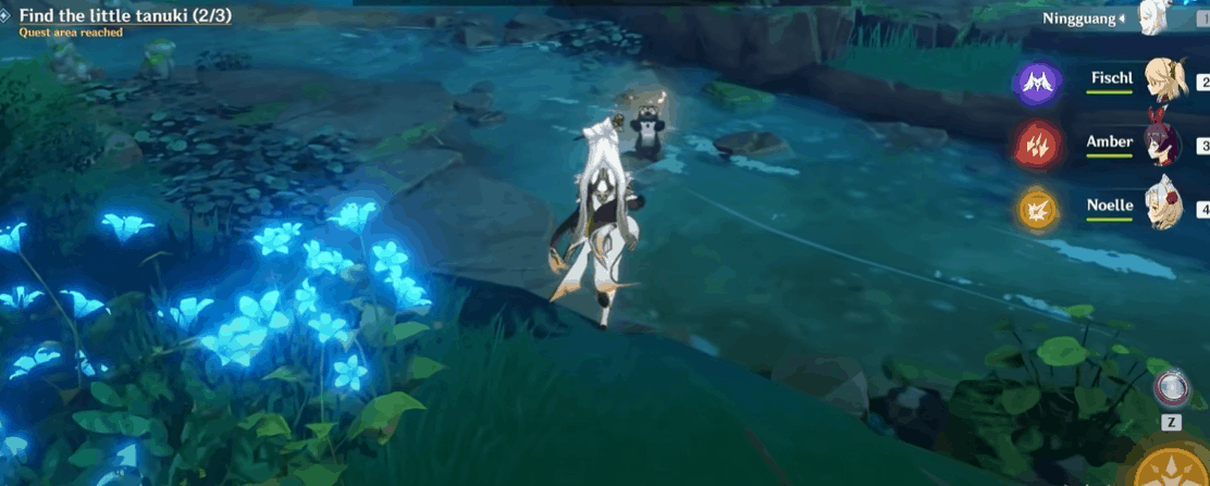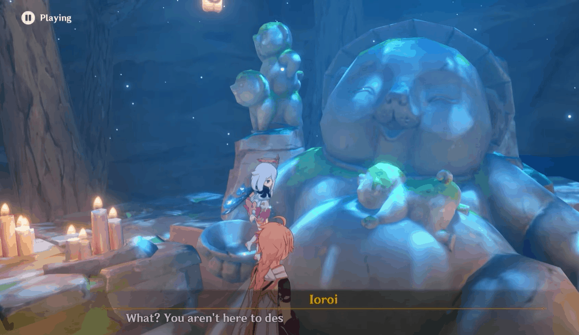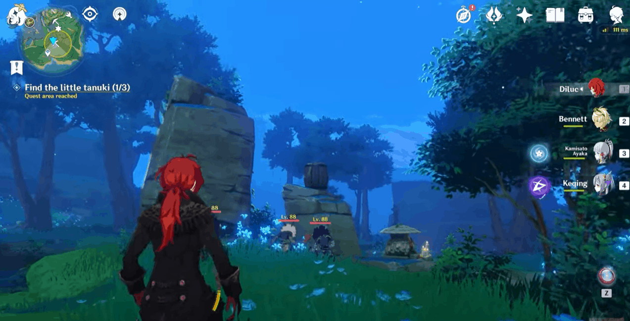 Go up the mountain pathway and on the left side, you will see a Tanuki statue surrounded by Hilichurls. After defeating the Hilichurls, talk to the statue named Ioroi and he will ask you to play with three tanukis. You can find the first tanuki by going down the pathway that you were following earlier. Follow the tanuki and attack them when they transform into objects.