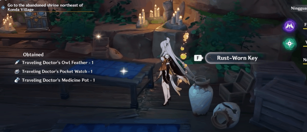 You’ll encounter a locked gate that you can open using the mechanism on the left of the gate. You will find another rust-worn key on one of the tables in this room. There is also a luxurious chest on the left corner of the room, and a stone slate item. Get both of these items and go to the abandoned shrine near the Konda Village. Talk to the mysterious shadow and it will disappear.