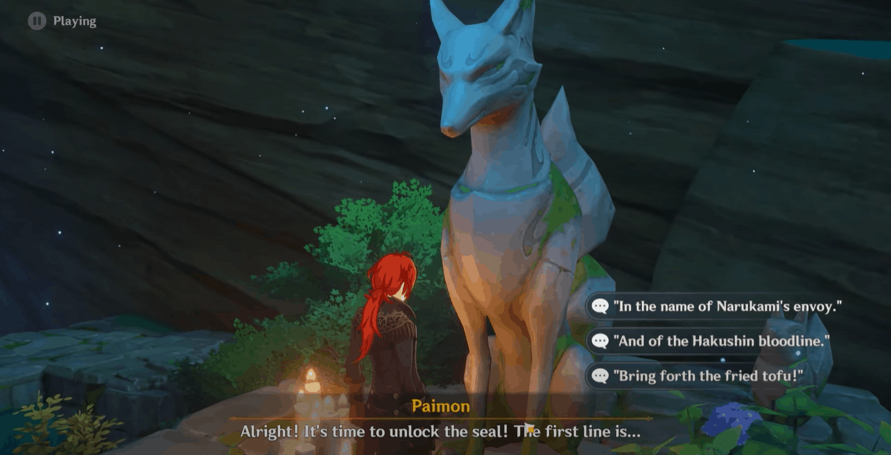 Go to the Sky Kitsune Statue east of the shrine and recite the following lines in the correct order: