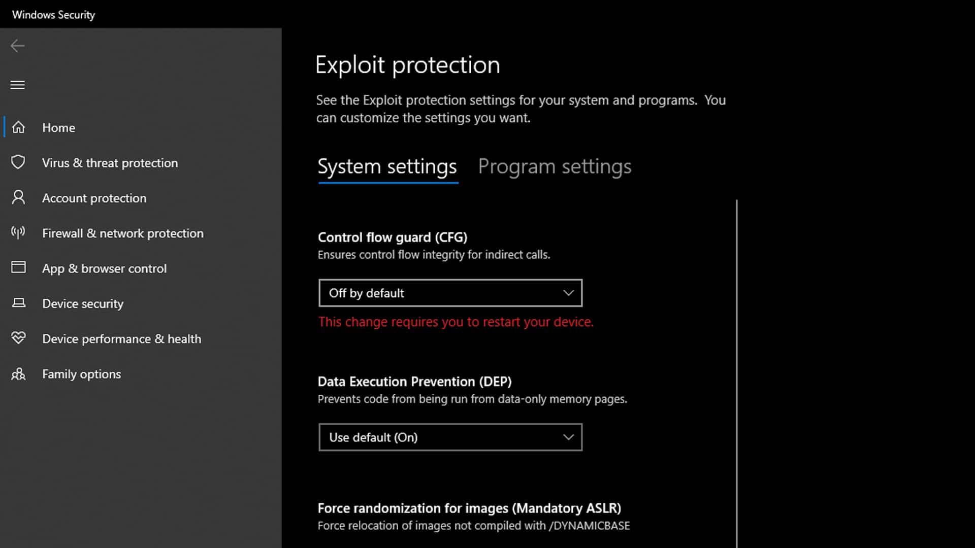 Under the ‘System Settings,’ you will find ‘Control Flow Guard (CFC). From the drop-down menu, select ‘off by default.’