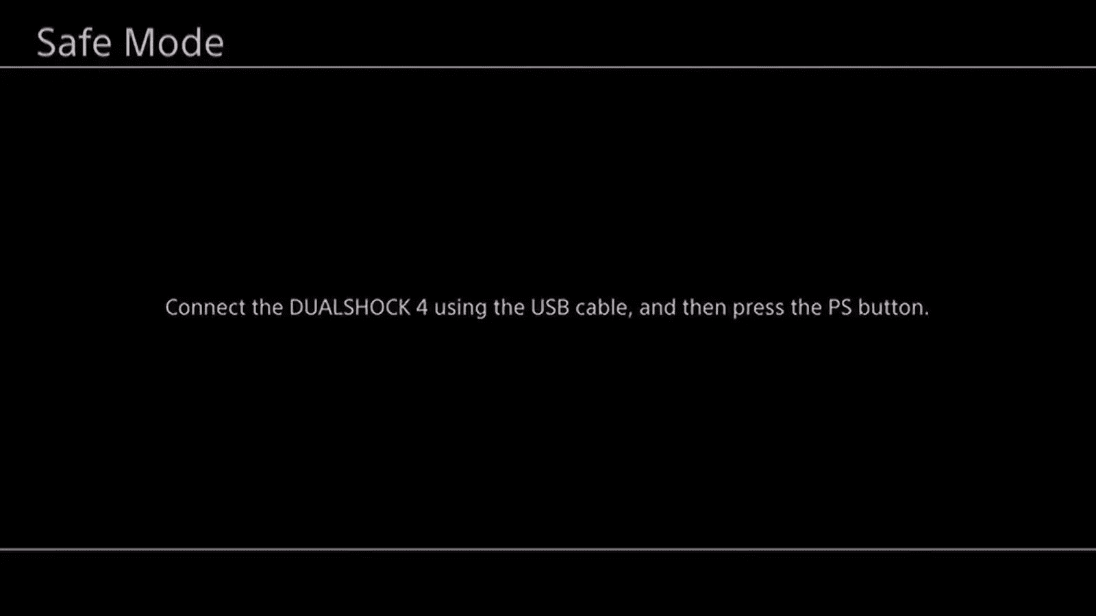 - With the PS4 off, hold the power button down. You will have one quick beep, keep holding until you hear another. If your TV is on, the image (as below) will state that you have entered Safe Mode.