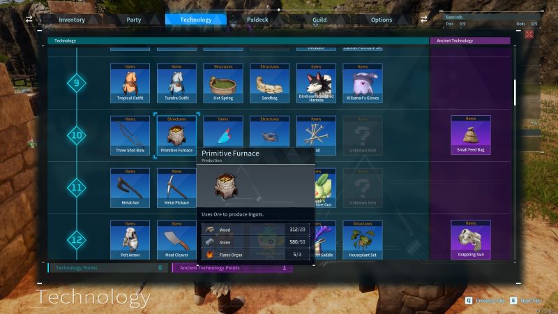 Once you’ve acquired the ores, you need to build a furnace which is unlocked at level 10. You need 20x Wood, 50x Stone, and 3x Flame Organ (acquired by killing fire type Pals) to build a furnace. You can then use the furnace to convert your collected ores into ingots. To make 1 ingot, you need 2 ores.