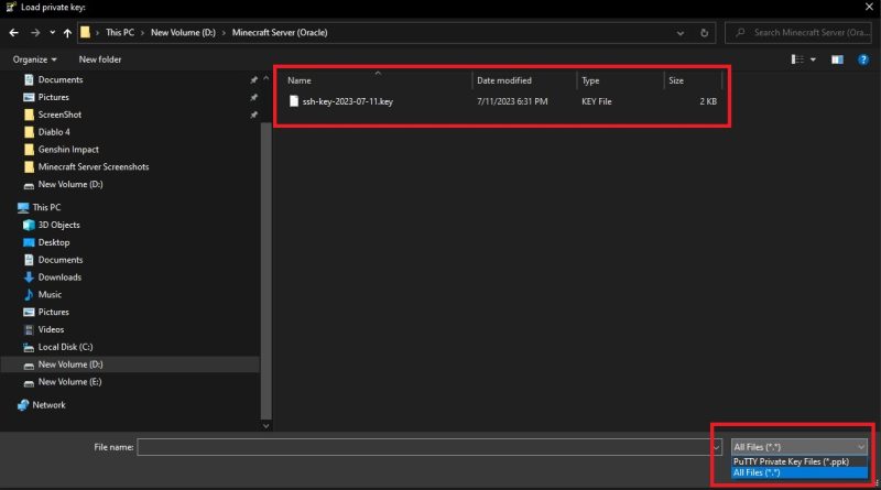 Navigate to the original SSH key you downloaded while creating your instance on Oracle Cloud and select it.