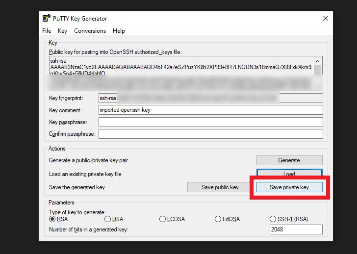 Once you’ve loaded the key, you will get a message saying you’ve successfully imported the key. Press OK. After that, click on ‘Save private key’ to save a PuTTY-compatible SSH key.