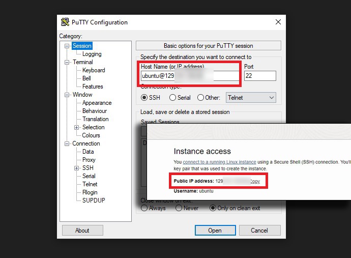 Once opened, go to the ‘Session’ and type in ‘ubuntu@yourpublicIP.’ This is the same public IP which was generated upon Oracle Cloud instance creation.