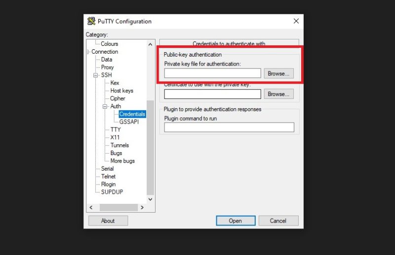 After that navigate to Connection > SSH > Auth > Credentials. Here you need to browse for the PuTTYgen created key to access your server.