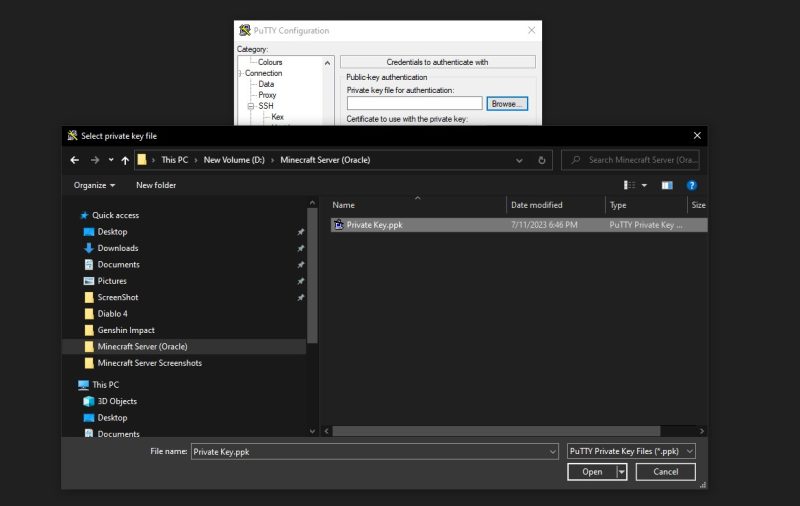 Browse to the key which was generated using PuTTYgen and select it.