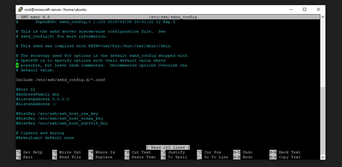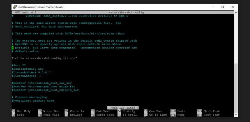 After that type in ‘nano /etc/ssh/sshd_config’ and you will see the following screen.