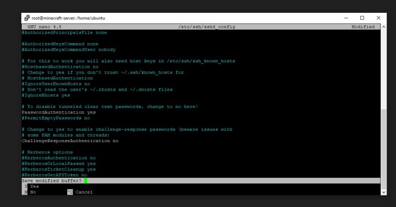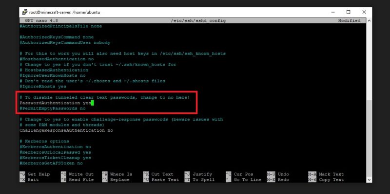 Scroll down (by pressing the down button) until you see PasswordAuthentication. There will be a ‘No’ in front of it. You must change it to a ‘Yes.’