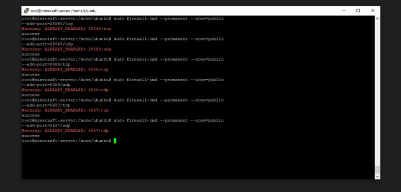 • sudo firewall-cmd –permanent –zone=public –add-port=25565/tcp