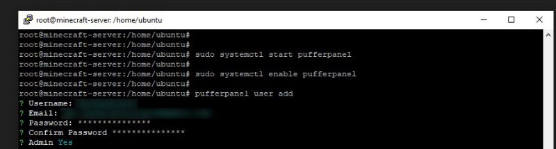 You will get a prompt to set your username, email, password, and whether you want the user to be an admin or not. Make sure you type in ‘Y’ when it asks to confirm you want the user to be an admin. You can review the official PufferPanel installation documents on their website.