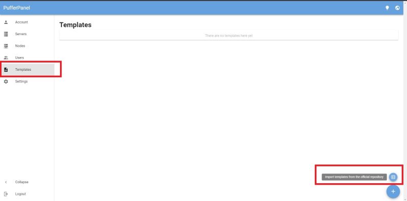 Once logged into PufferPanel, you can start creating your Minecraft server. First, navigate to the ‘Templates’ and click on the small icon at the bottom right corner to import a server template.