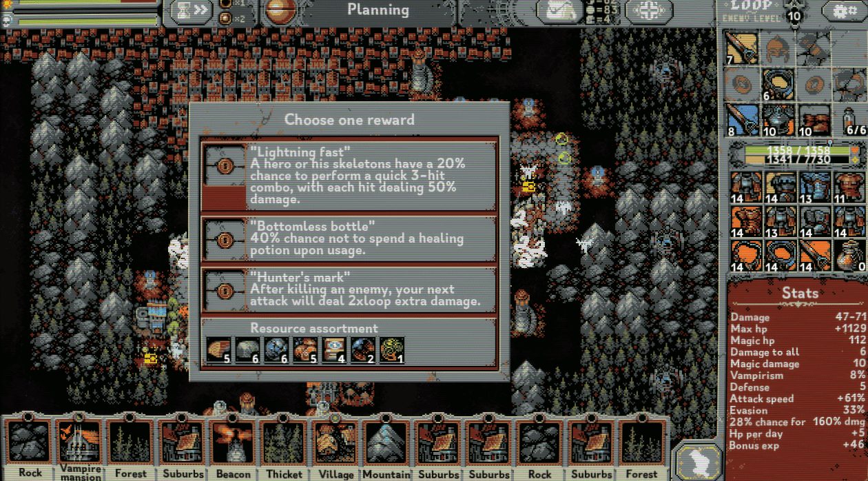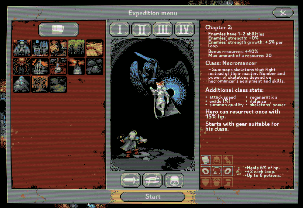 Depending on the class you chose, you need to build around them. For Rogue class, focus on increasing your attack speed with forest and thicket cards. If you are using the Necromancer class, focus on increasing your summoning quality as usual and getting your skeleton level equal to or higher than your loop number.