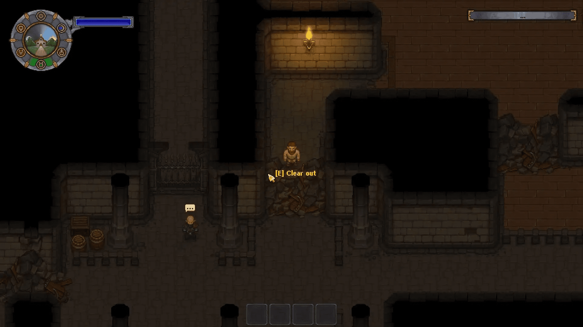 Once you have the necessary materials, enter the tunnels underneath your house and speak with Snake; he’ll be there every night. He’ll ask you for 5 faith and the key to open the gate to the dungeon. To make this key, you need to combine the keeper’s key with two faith at the study table underneath the church.