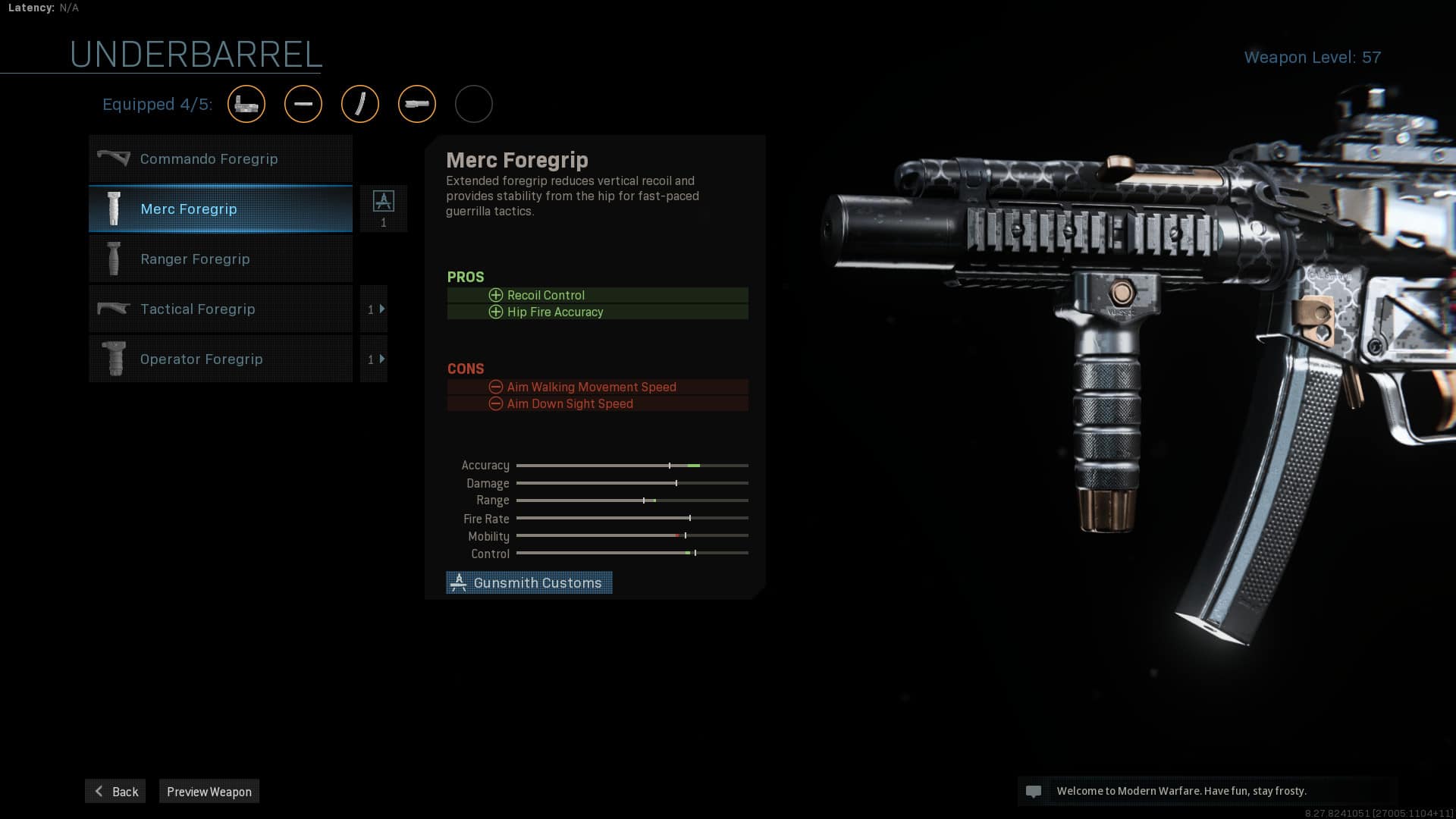 For your Underbarrel attachment, you must select the Merc Foregrip. This is one of the best attachments when it comes to CQCs. It gives you increased hip-fire accuracy, which helps you easily take out enemy players without aiming down sight.
