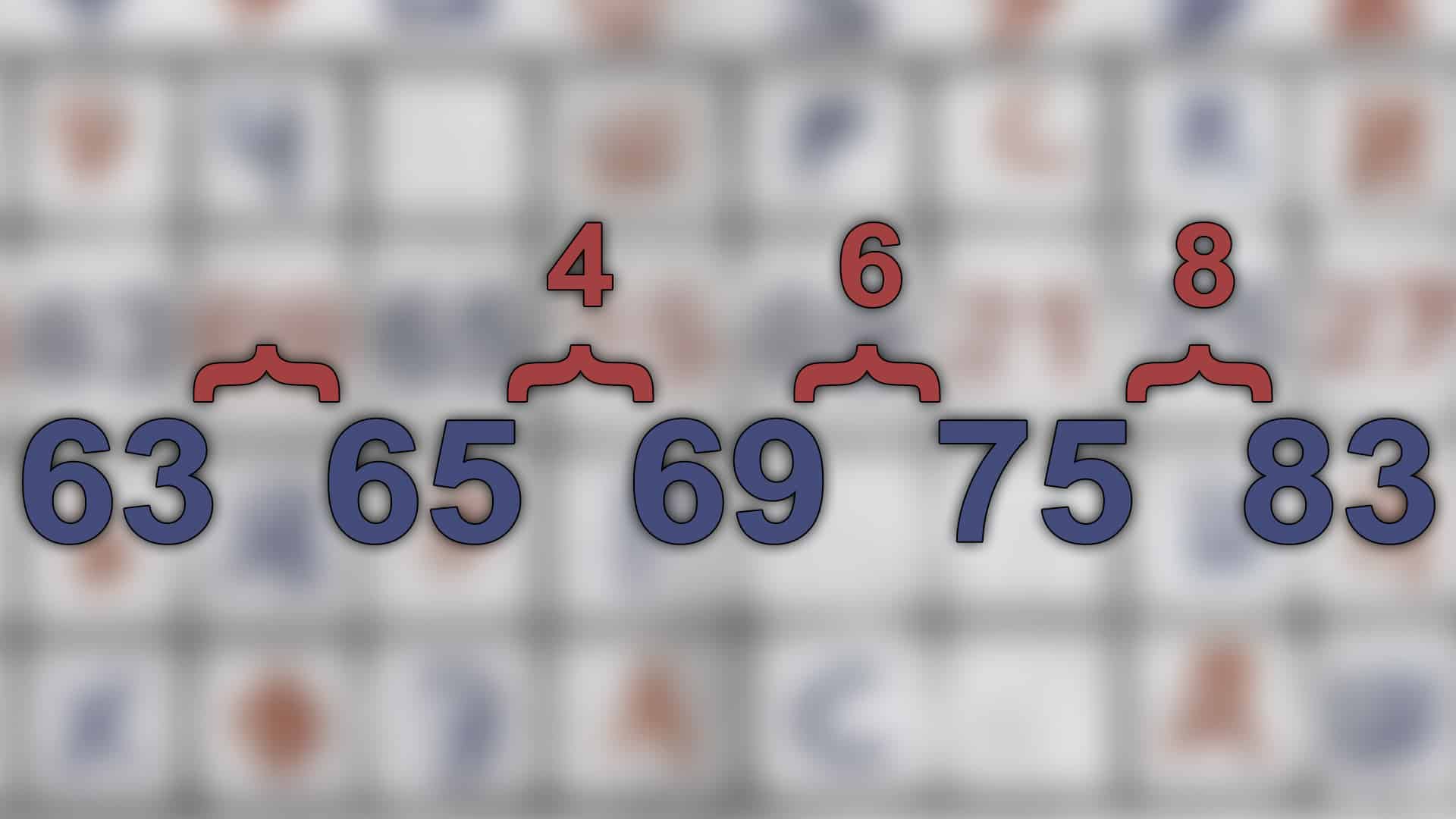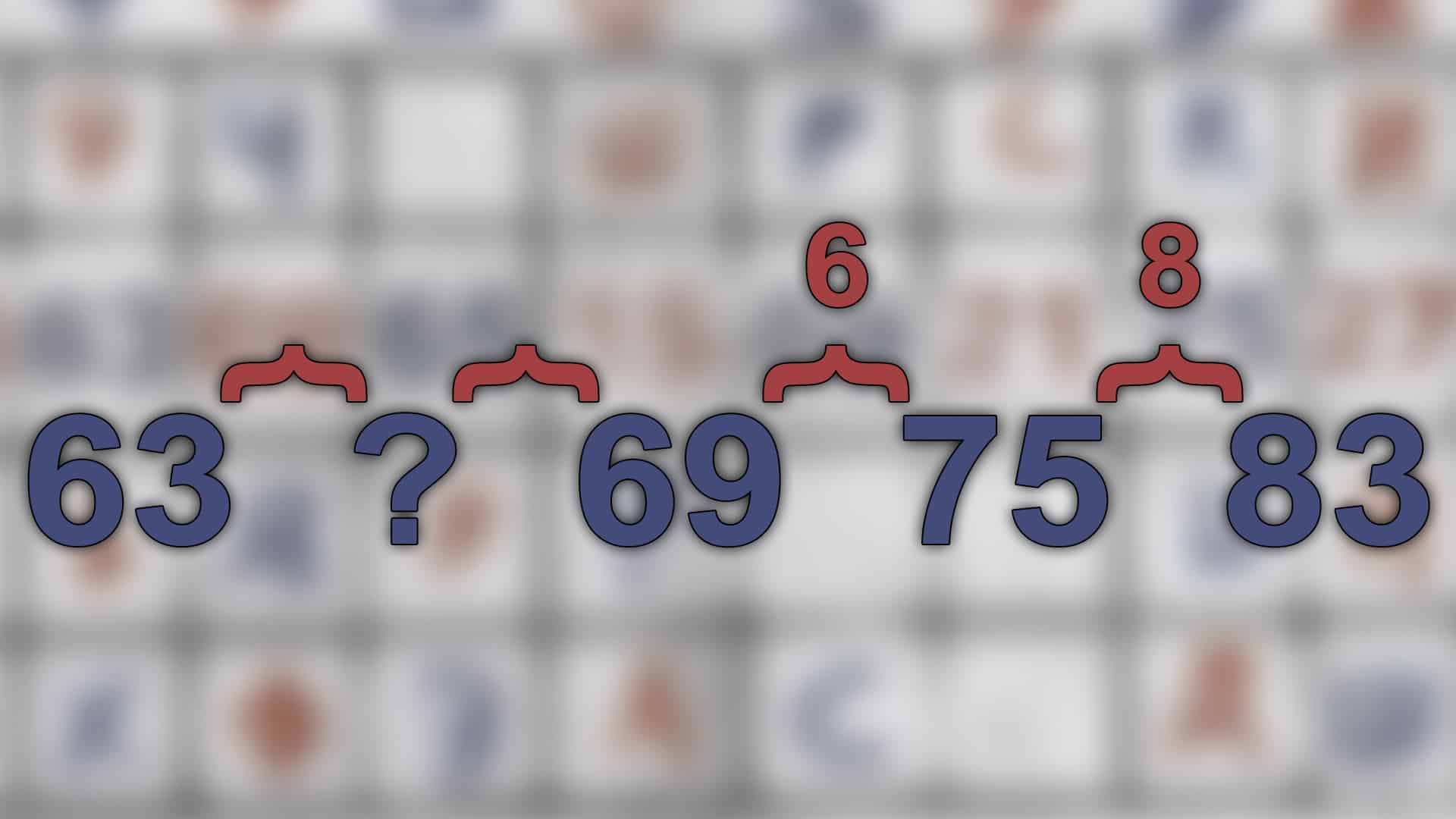 To ensure we get the far left number as 63, we must follow the same pattern of decreasing the difference by 2 every time. We will get our missing number, which is 65, by subtracting 4 from 69.