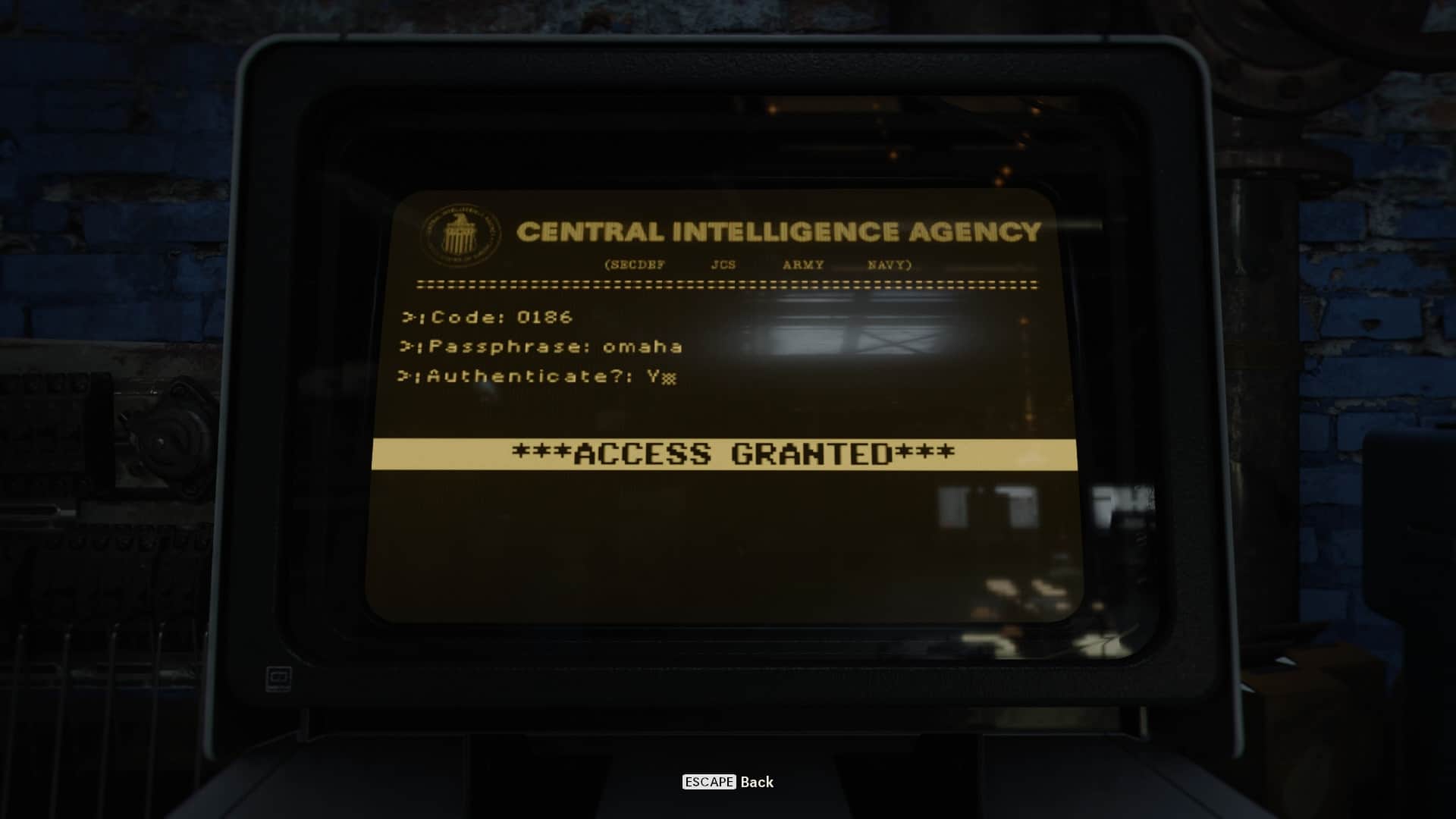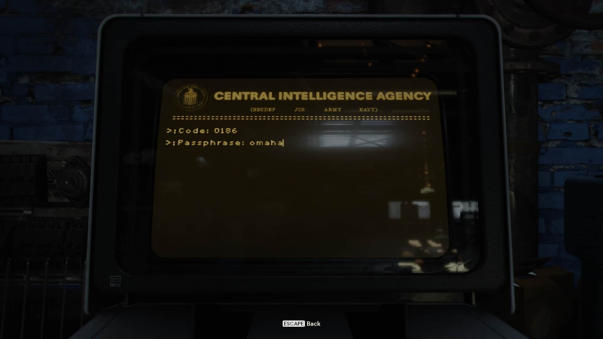 Now that you have the code (0186) and your passphrase (Omaha), you can enter it in the terminal to decrypt the floppy disk. Click on the floppy disk to access the computer terminal.