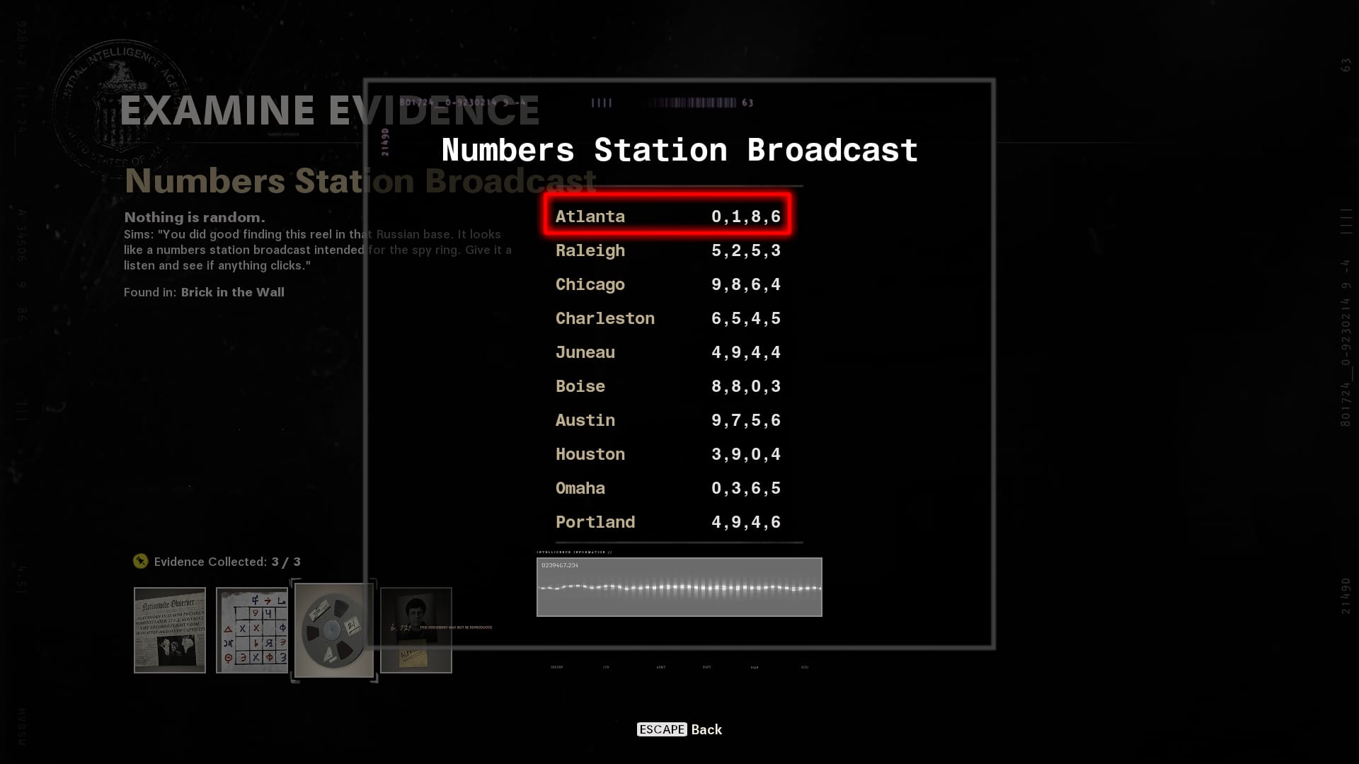 Once you’ve identified the city’s name, open up the Numbers Station Broadcast and check the numbers corresponding to that city. As you can see from the image below, Atlanta has the numbers 0,1,8,6.