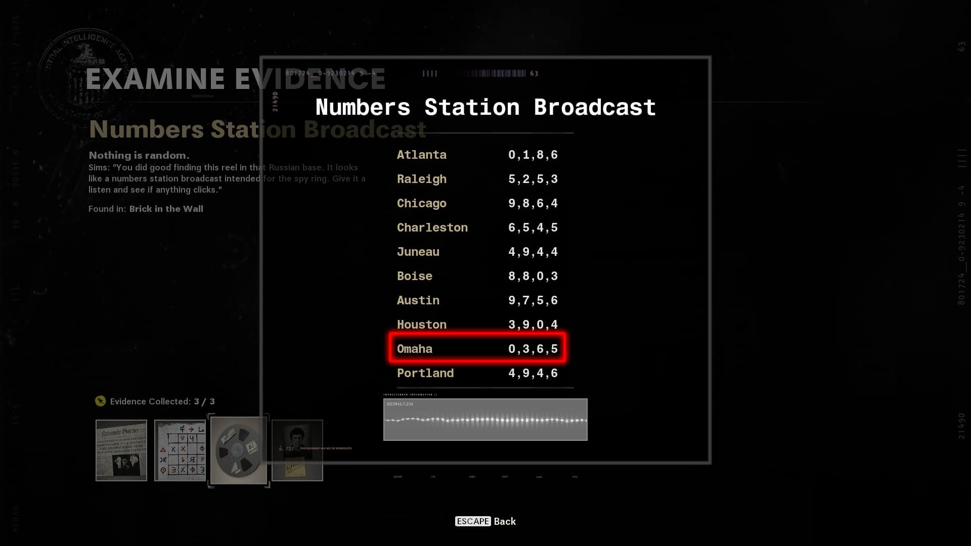 - Numbers Station Broadcast: The third evidence is collected during the mission called ‘Brick in the Wall’ You will meet an informant who asks you a favor of finding her contact, to either help rescue him or eliminate him.