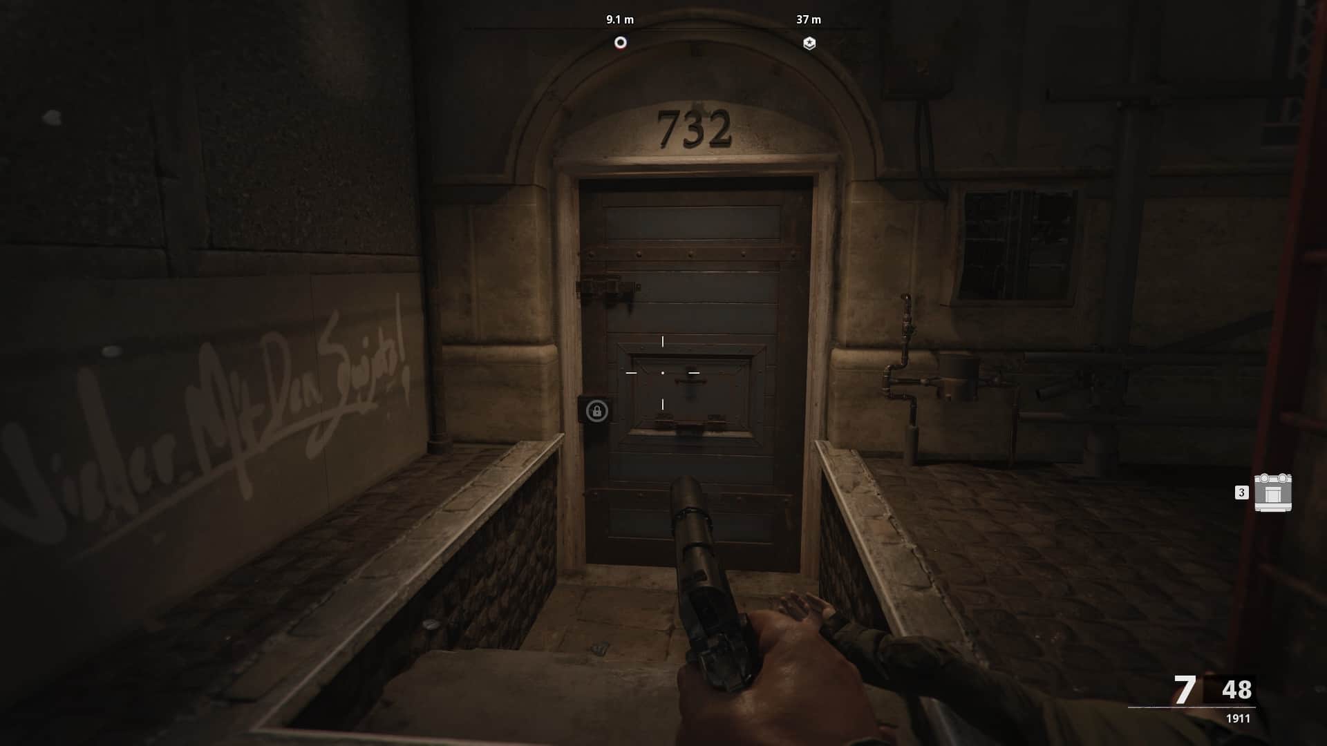 Make your way to the informant who is held in the basement of an apartment. There will be several Stasi (guards) on your way to the basement. You will come across a door with apartment number 732. There will be a guard outside. Take him out, pick the lock, and enter the building.