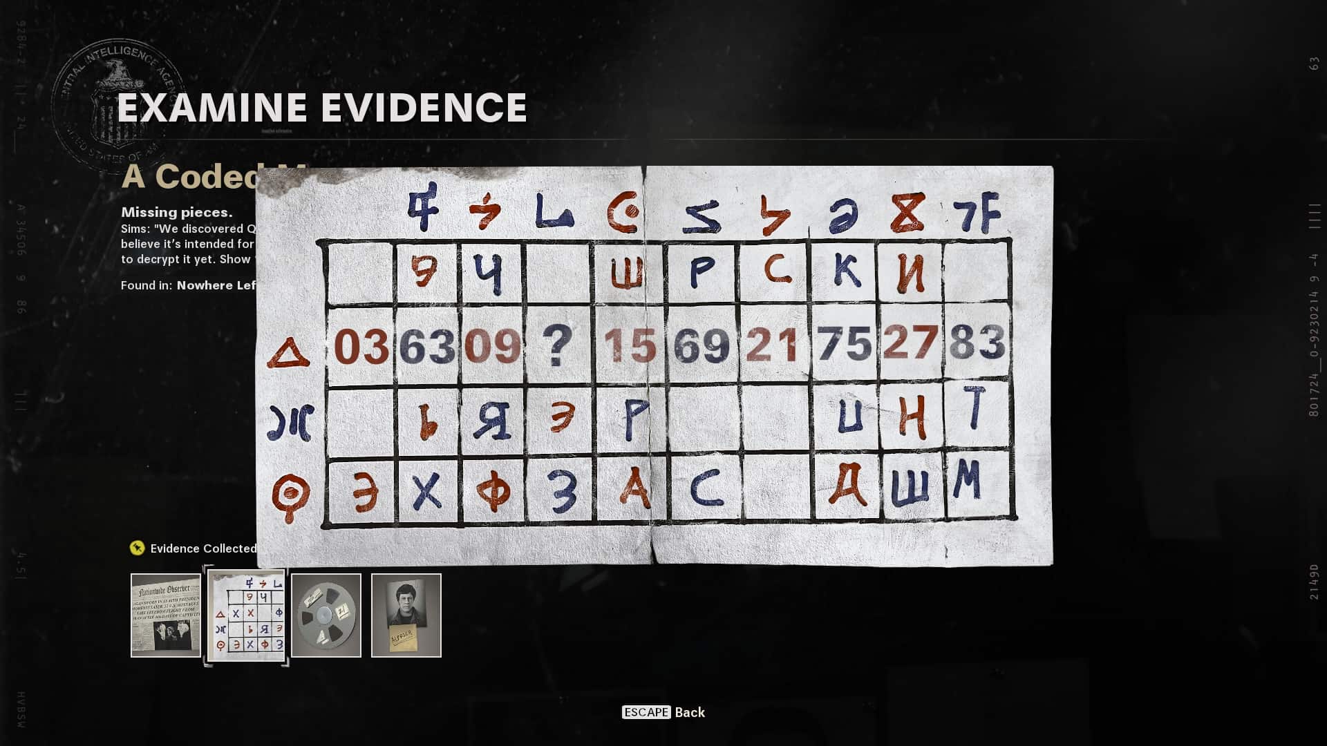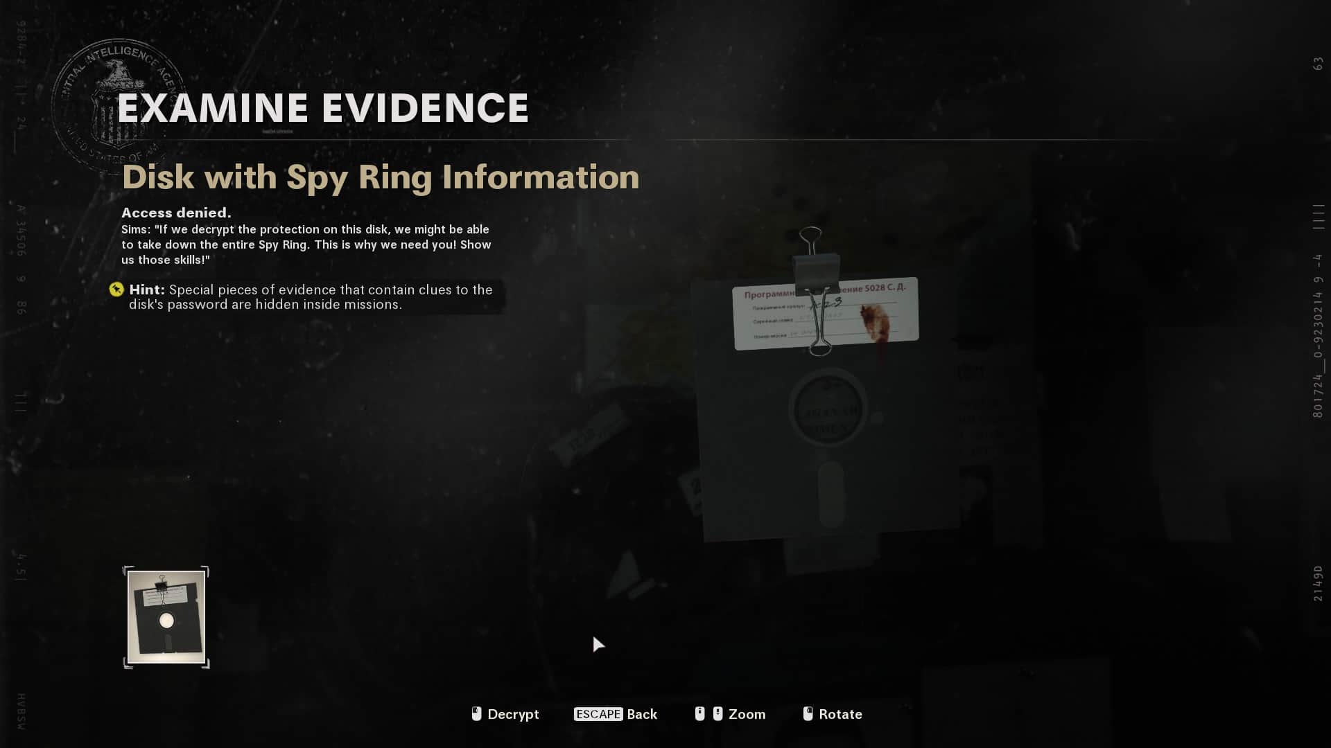 Once you’ve collected all the evidence, we can proceed with Operation Chaos floppy disk decryption and, finally, the mission itself. To decrypt the floppy disk, we need a code and a passphrase that we can get by using the pieces of evidence that we’ve collected from various missions.