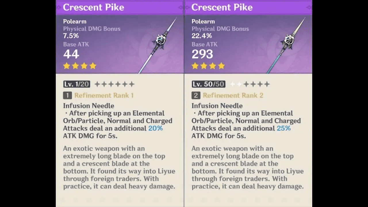 Crescent Pike is a good option for physical damage Rosaria. You can also craft this weapon at the blacksmith. The Pike gives you a base attack of 44 at level 1 and has an effect called Infusion Needle. Infusion Needle increases your normal and charged attack damage by 20% every 5 seconds every time you get an elemental orb. You can craft the Crescent Pike using the following materials: