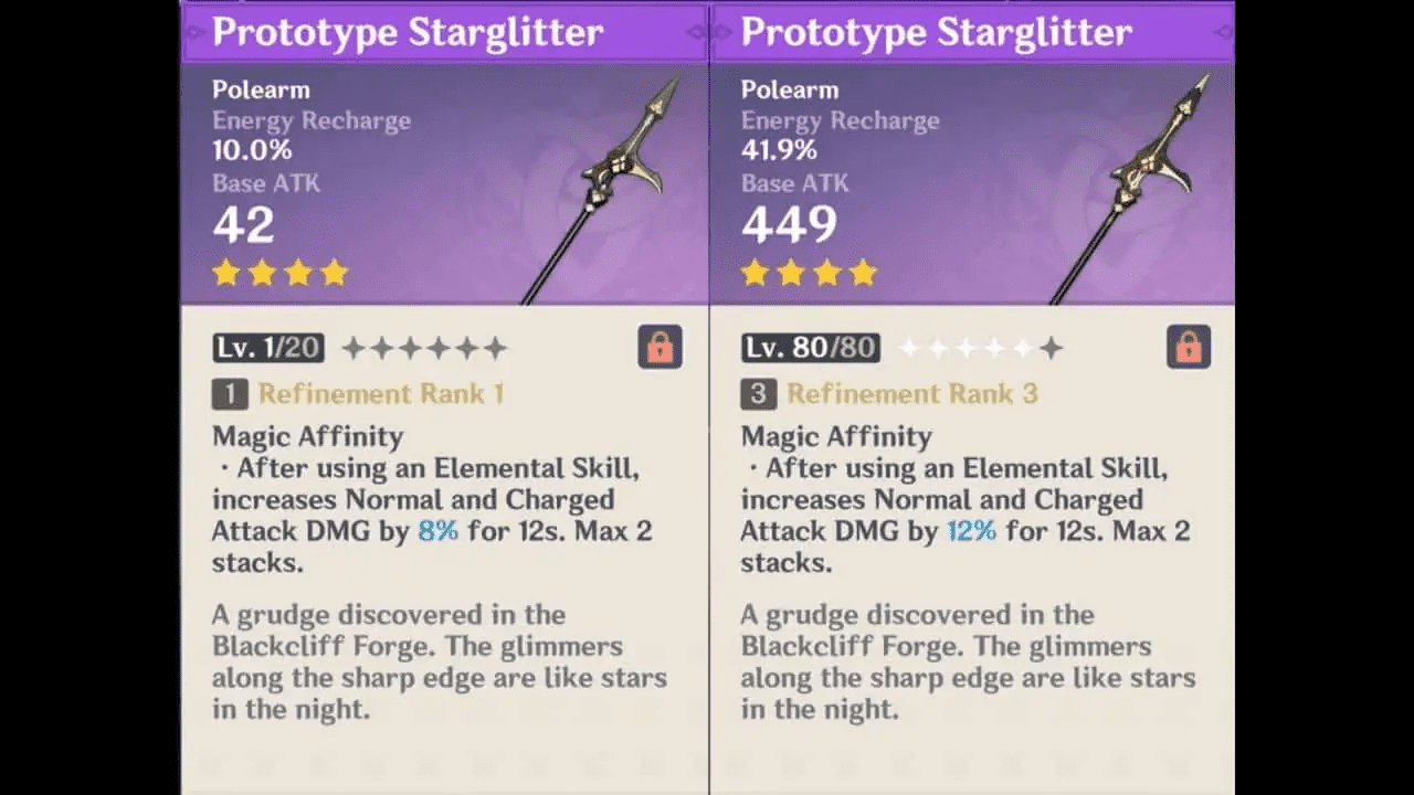 Prototype Starglitter is a good four-star polearm choice for Rosaria. This weapon works especially if you have Chongyun in your team. At level 1, Prototype Starglitter gives you 42 Base ATK and has the effect called Magic Affinity. Magic Affinity increases your normal and charged attack damage by up to 8% after using an elemental skill. You can forge Protoype Starglitter using the following materials: