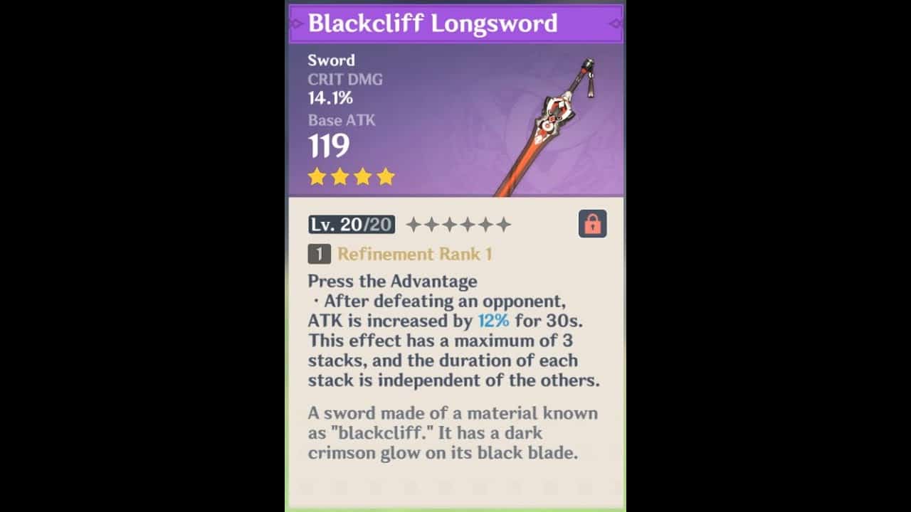 If you have enough Starglitter saved up, you can go and get the Blackcliff Longsword in Paimon’s Bargains for Ayaka. This 4-star sword costs 24 Starglitter and has a CRIT Damage sub-stat. Whenever you defeat an opponent, your attack increases by 12% for 30 seconds. You can stack this effect up to three times and the duration for each effect will be separate to one another.