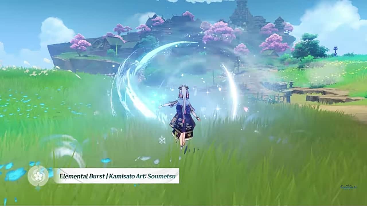 Kamisato Art: Soumetsu is Ayaka’s Elemental Burst. Using her burst will unleash a snowstorm that will move forward, applying the Cryo element to all the enemies it passes through. After the duration of the Elemental Burst, the snowstorm explodes, dealing massive damage to enemies around it.