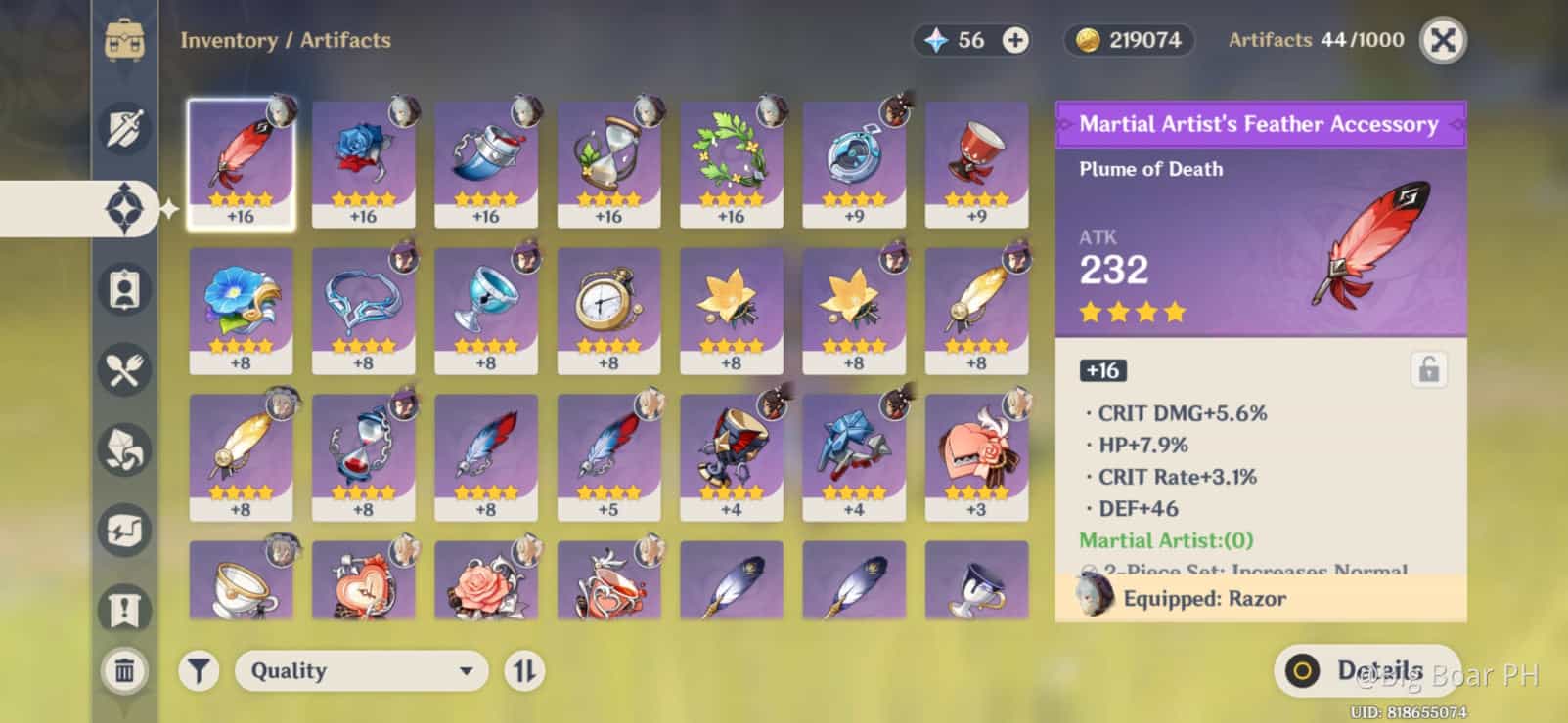 If you are still in the early phase of the game, or you do not have the sets above yet, you can replace them with 4 pcs. of Martial Artist. This artifact set is great for beginners in the game who recently got Ayaka. You can get this artifact set in the Hidden Palace of Zhou Formula and Ridge Watch. 2 pcs. of this Artifact Set will increase your normal and charged attack damage by 15%.