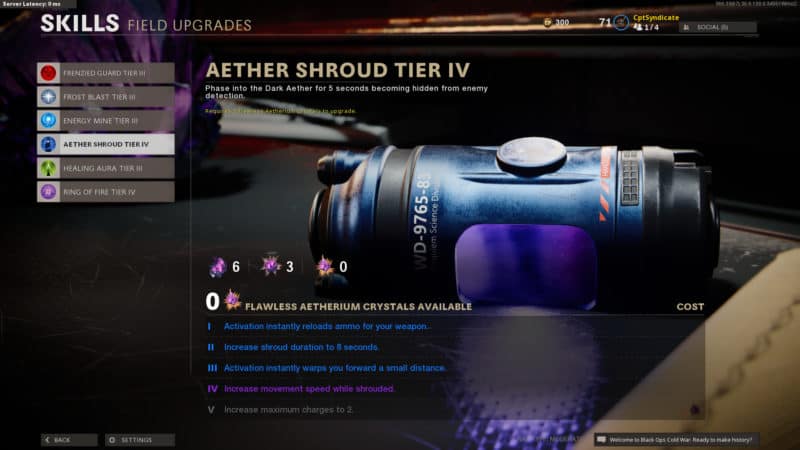 - Aether Shroud: The Aether Shroud Field Upgrade is beneficial when carrying the crystals, especially when it is upgraded to Tier IV and V. Upgrading to at least Tier IV allows you to move much faster when shrouded and upgrading to Tier V allows you to hold a maximum of 2 Aether Shroud charges.