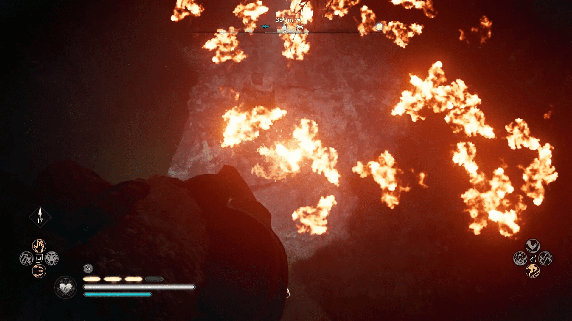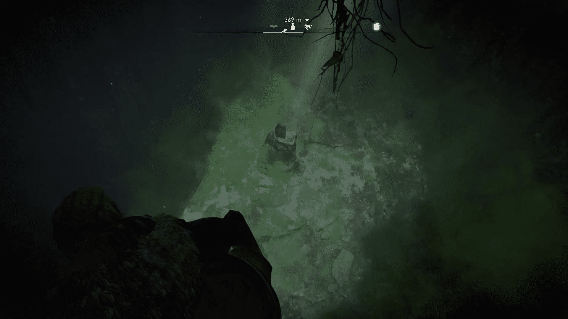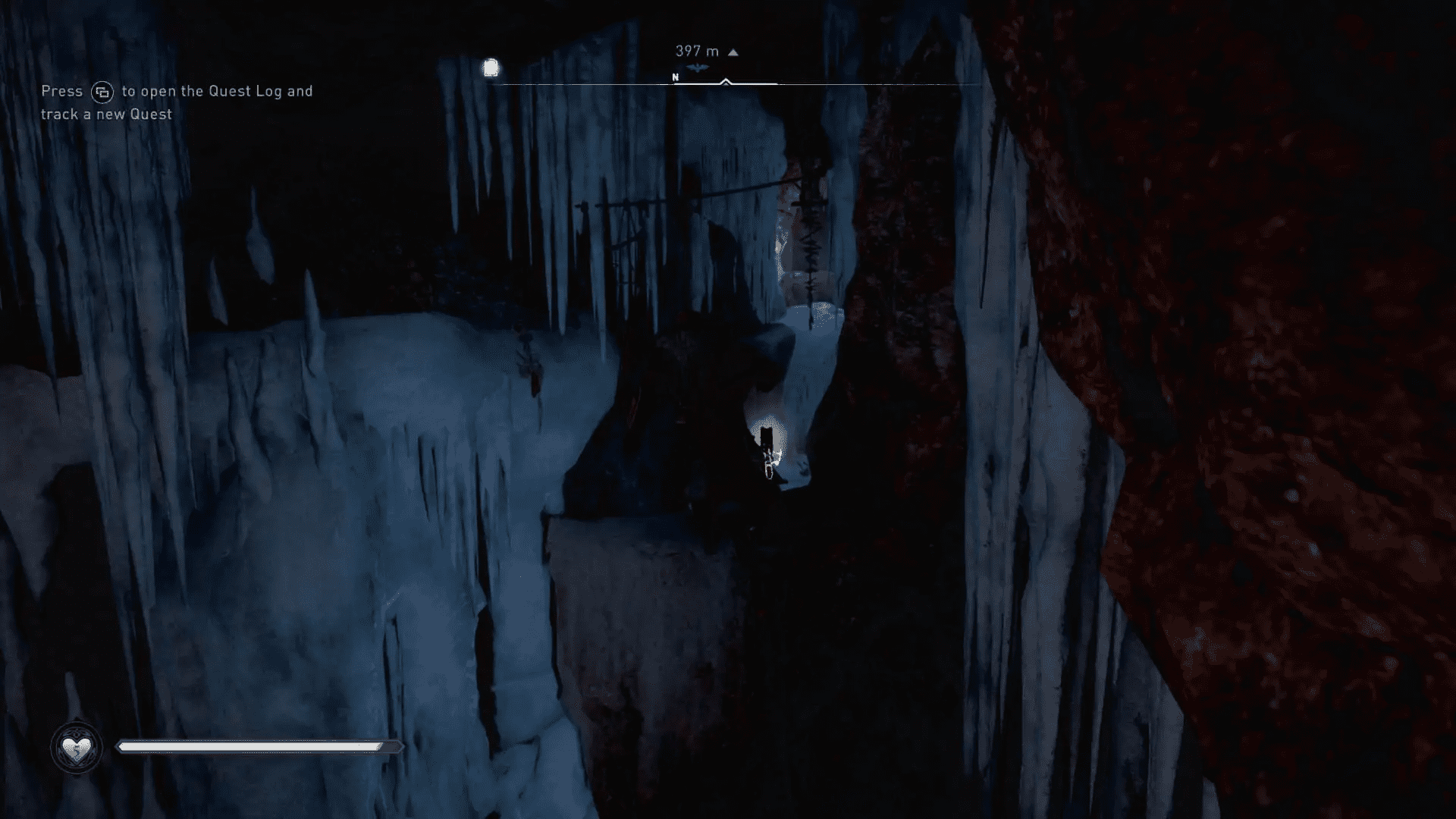 Continue going deeper into the cave, and you will come across a spiral path up to the ledge that you can grab and shimmy across. But, before jumping over to the vault, throw another torch at the poisonous gas to clear your path.