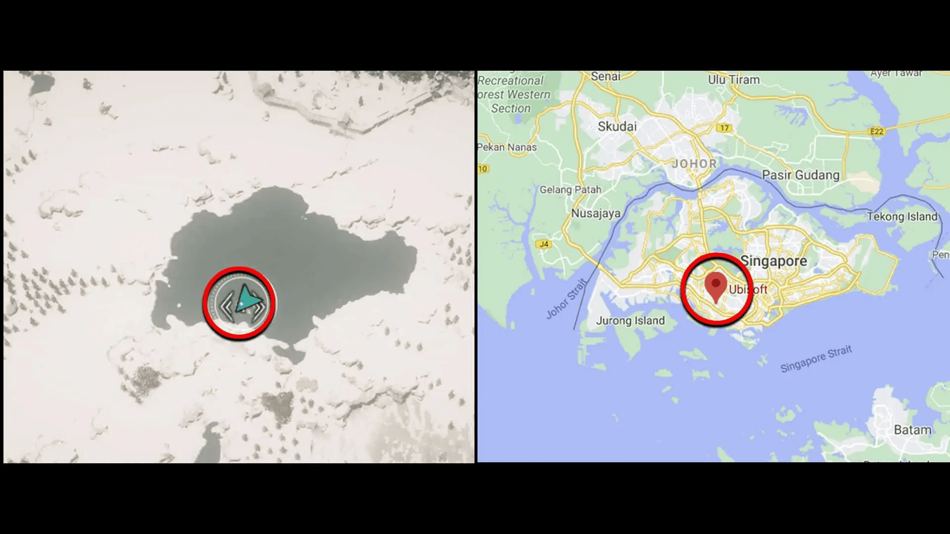 Now, to narrow down the specific location of the bow, it was observed by the community that the lake resembles the map of Singapore. Interestingly enough, when we compare the in-game map with the real-life map of Singapore, it represents the same shape. Another cool thing to notice is that if we search for Ubisoft’s Singapore Headquarters, it corresponds to a small rocky island on the in-game map. And that is where the unbreakable rock containing the Nodens’ Arc Bow is located.