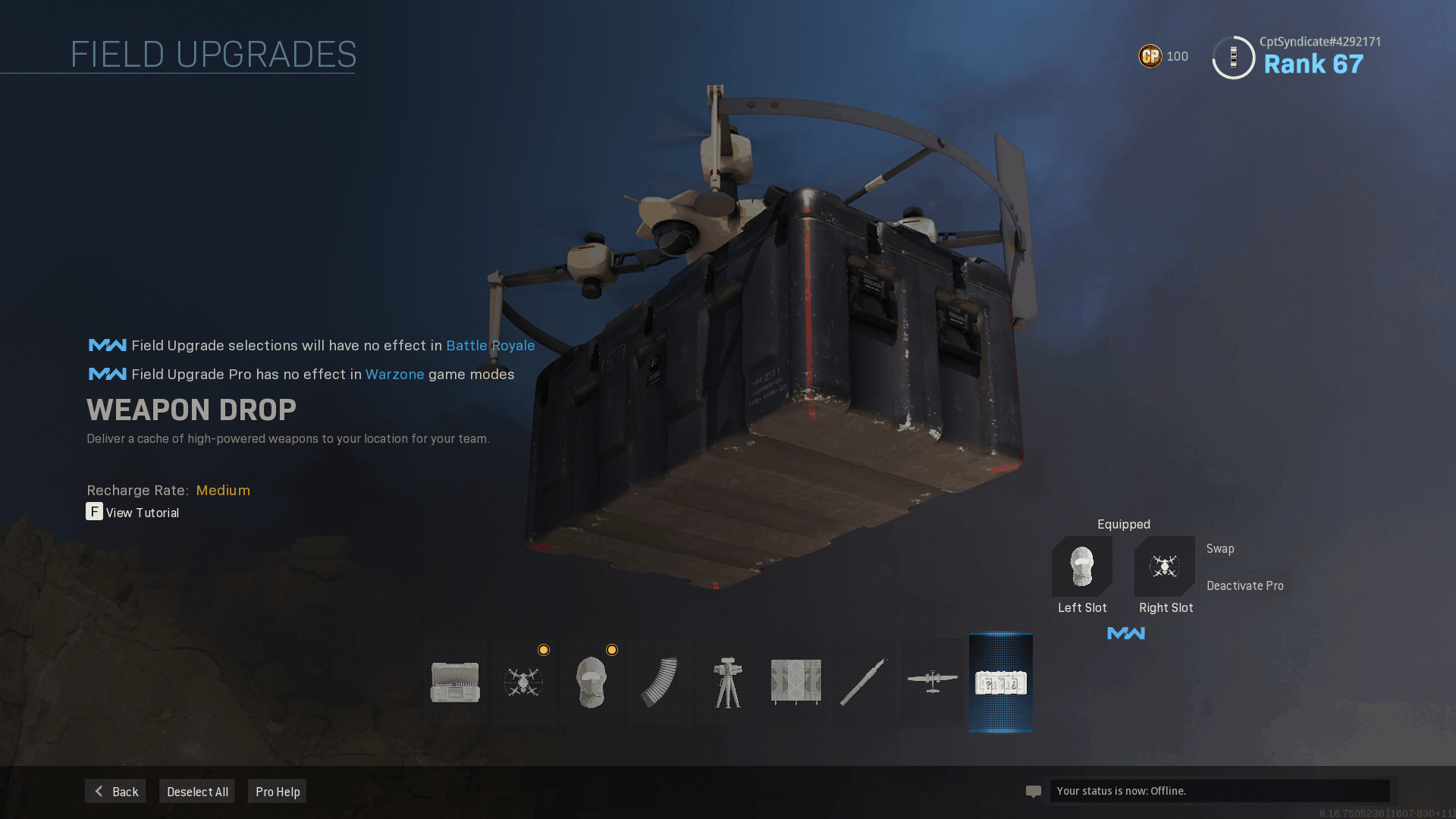 This Field Upgrade is both powerful and random at the same time. You can use this Weapon Drop to mark a drop point for a weapon cache which will be filled with high-powered weapons that have attachments using all five slots. You can choose either a fully customized weapon from the weapon cache or add additional attachments to your currently equipped weapon. The choice is yours.